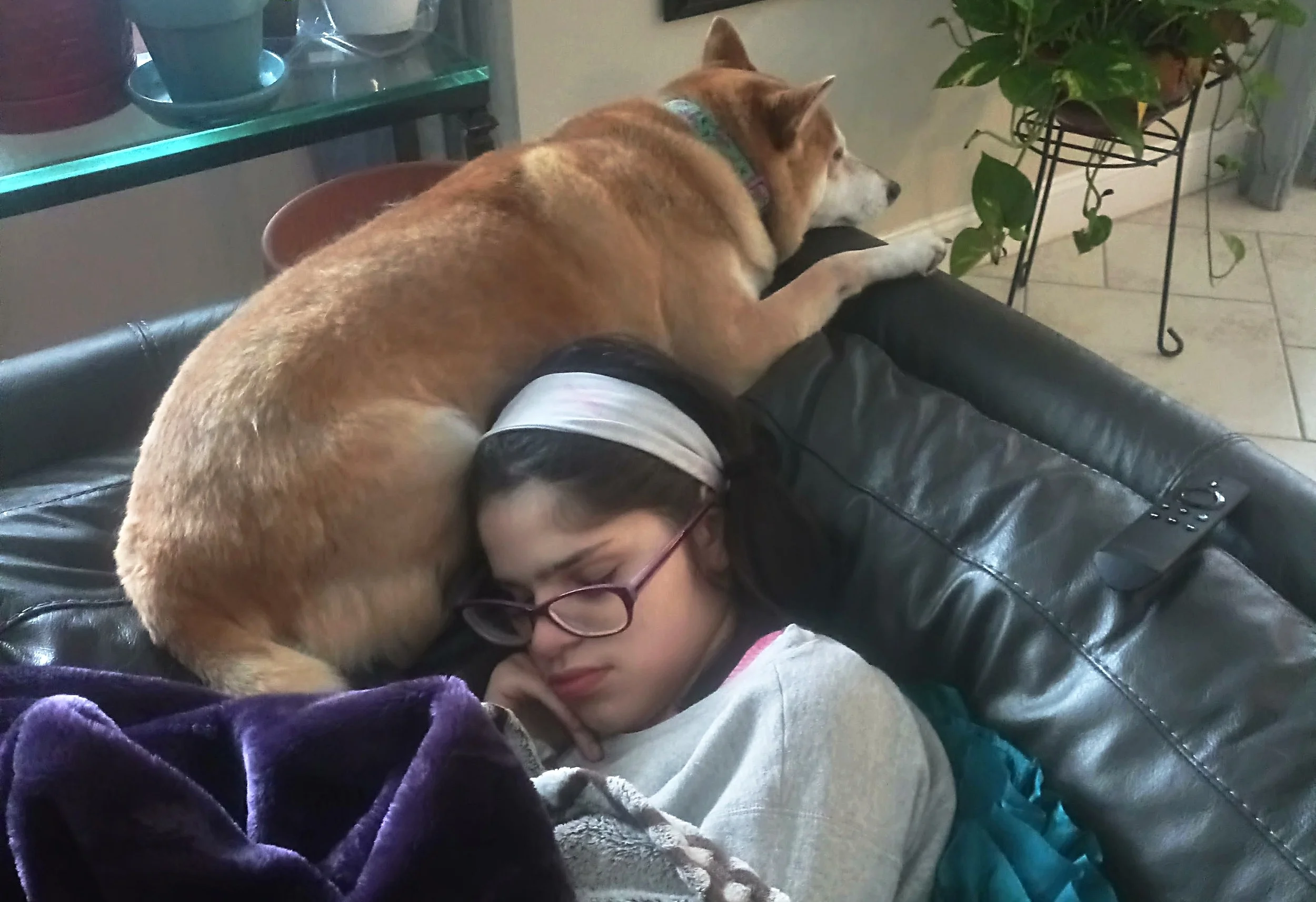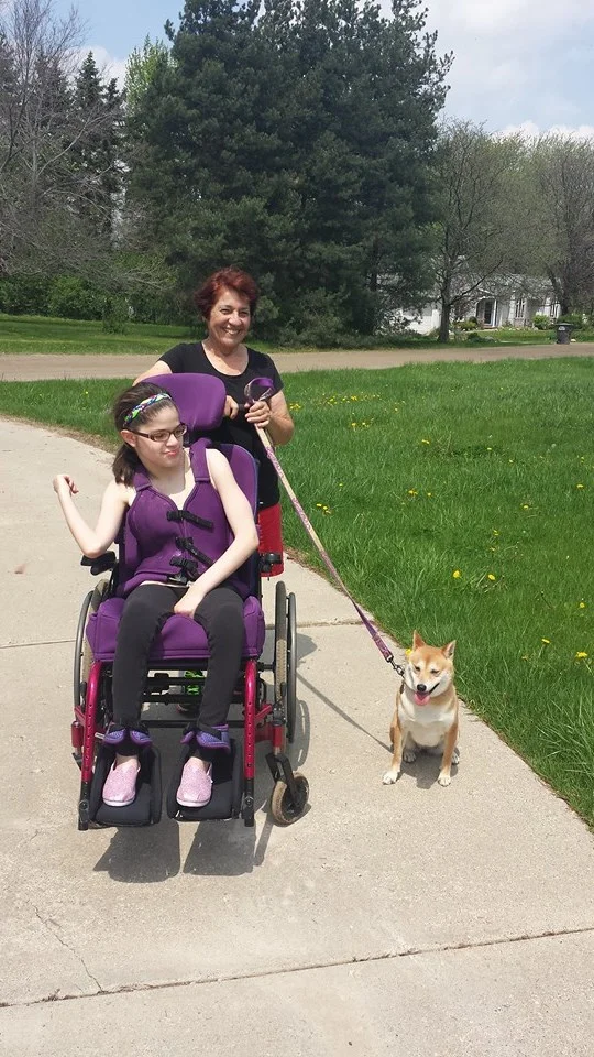 Truthfully, the main reason for getting a dog was for Sofia, our loved one with Cerebral Palsy. We knew many people in the disability community who had dogs and mentioned that the dogs enhanced their quality of life. This resulted in extensive research on different breeds and deciding what we wanted in a dog. Once we decided, we welcomed Hana, a red Shiba Inu, to the family. As you can see, Hana is always by Sofia, she even sleeps with her. There is a special bond between human and animal, but I believe it is even more special when the dog has a purpose/ job. In our case, Hana is not a professionally trained dog, but she knows Sofia needs special attention and care, making Hana her helper.